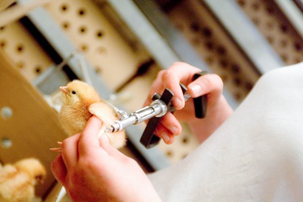 Die Küken werden in der Brüterei mit der Nadel mit einem Vektorimpfstoff geimpft. Dann in der 3. Woche, 6. Woche und 13. Woche über das Trinkwasser nachgeimpft.